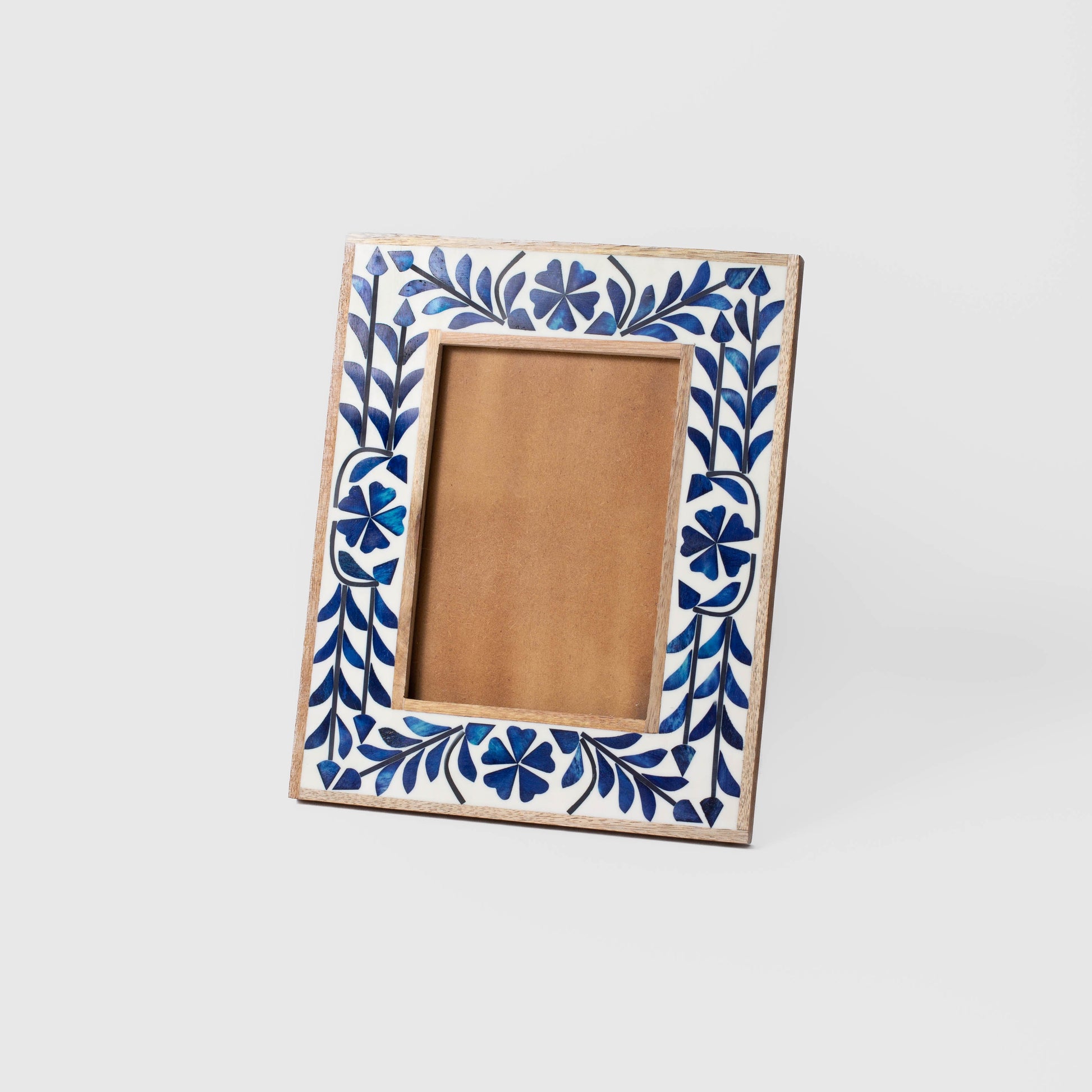 The Blue Belle Inlay Photo Frame will bring a cheerful element to your home. The hand carved indigo bone flowers are inlaid into a resin base. The frames hold 4x6 and 5x7 photographs. Frames can stand horizontally or vertically. Arrange among other frames or individually.
