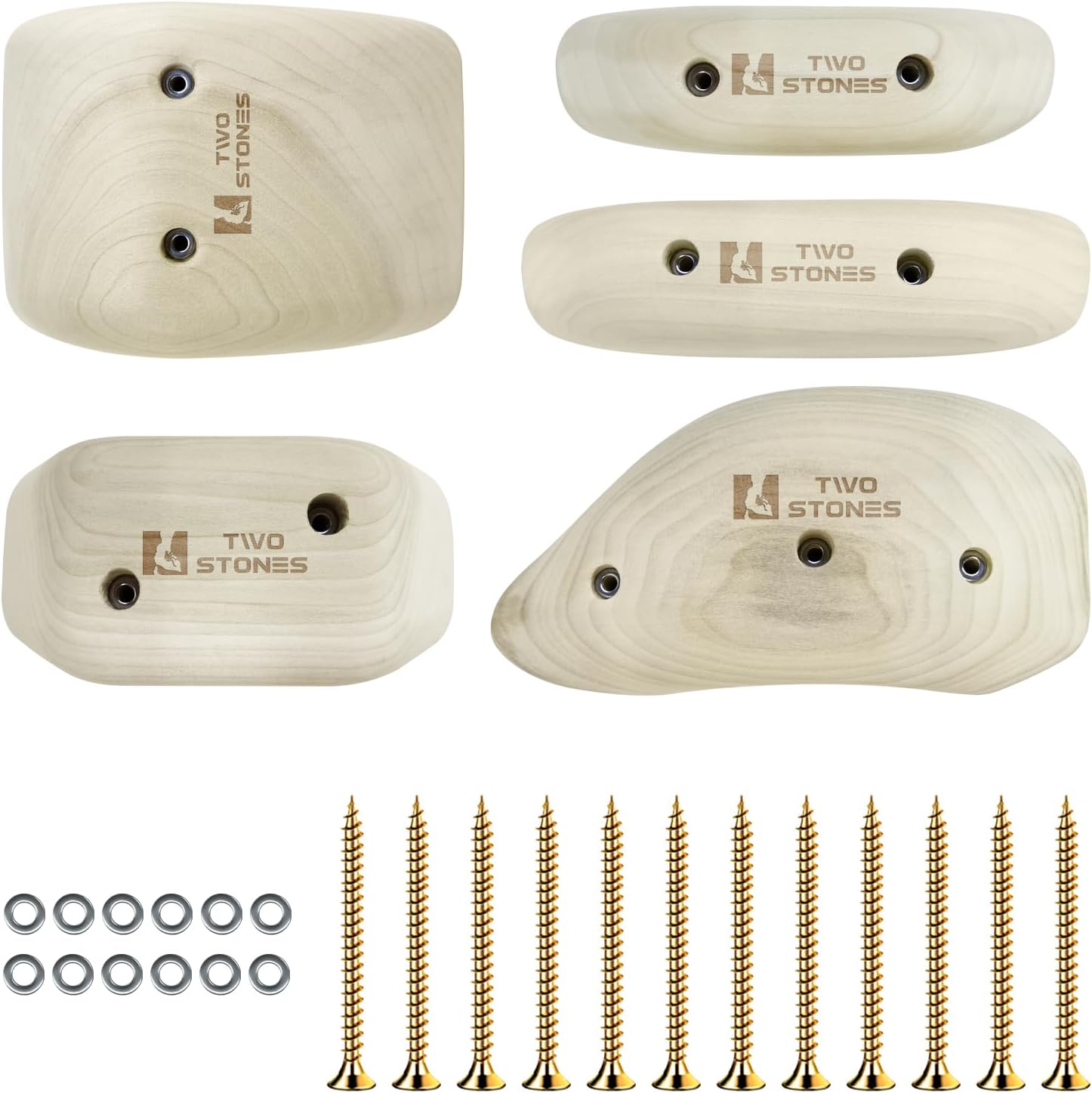 TWO STONES Wooden Rock Climbing Holds for Adults | Wood Rock Wall Climbing Holds | Variety Screw On Climbing Hold Grips Set with Mounting Hardware (HD5in1-B)